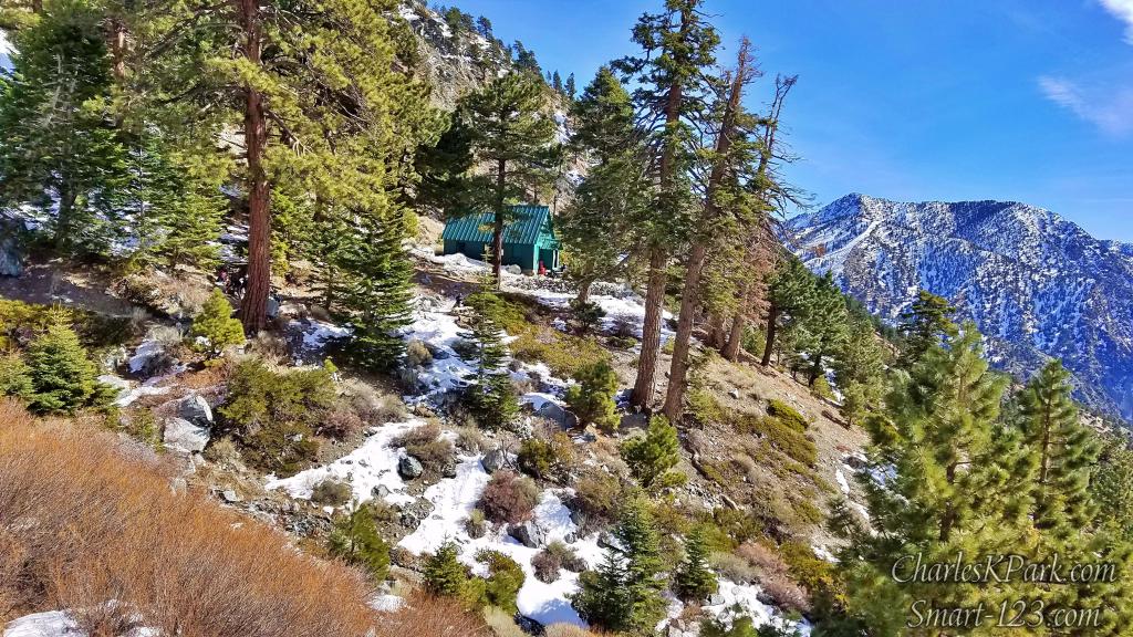 The Ski Hut Trail, named after the green ski hut (officially, San Antonio Ski Hut), sits below the Baldy Bowl or halfway up the summit. When there is a lot of snow, people can ski down the bowl. On this day, there were many ice ax climbers participating in a class or climbing up the Baldy Gulch.