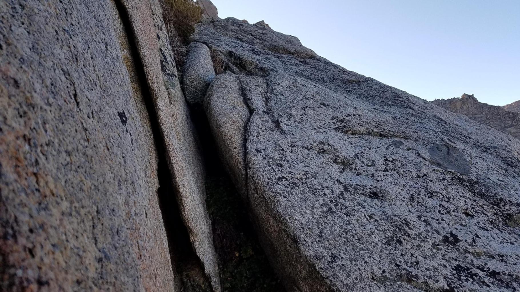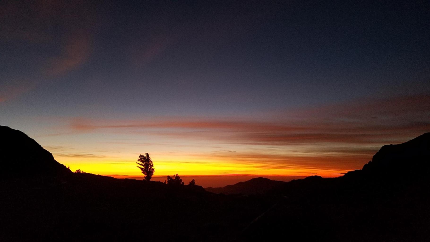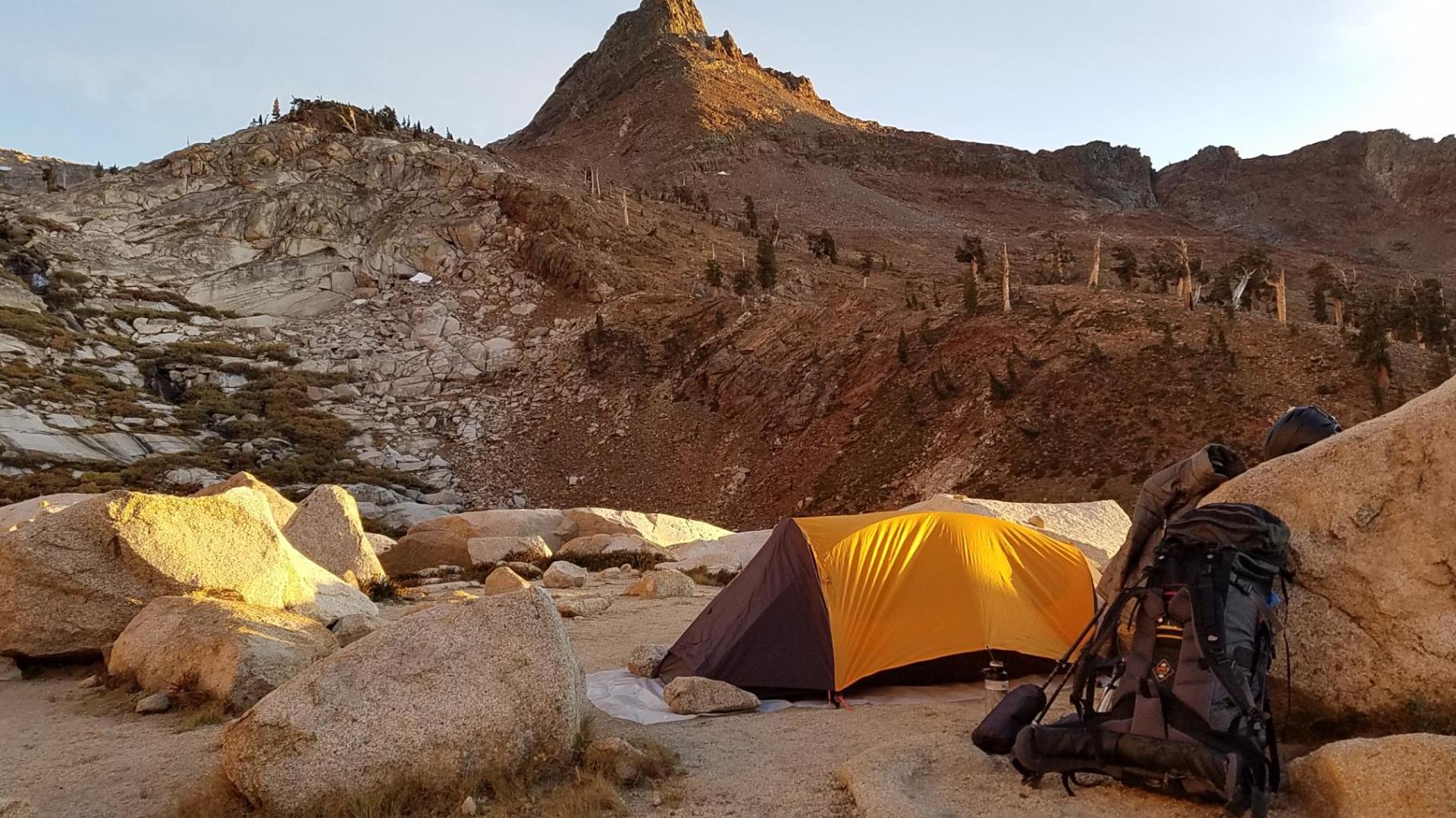At the campsite, there was only one other party who were out of view about 50 yards away, a couple of guys fishing the lower Monarch Lakes. I found a secluded spot a bit above the ranger installed toilet, pitched tent, and cooked dinner out of freeze-dried food; it was not very good and I ended up not eating all of it – likely due to my exhausted condition. The night was warm enough, likely only reaching below freezing a few moments, as I noticed there were only a few ice crystals in the water bottle (I kept one in the sleeping bag) the next day, but I could not get deep sleep. My heart rate seemed to be elevated, I still had the headache, and I had a lot of silly dreams. Still, I was able to get out at the moonless night and enjoy the the peace under the Milky Way. Referencing my astronomy app, I was able to locate Saturn and Jupiter. By early morning, the headache was mostly gone, and I felt rested. It felt good to get up up in the moonlit darkness, cook and eat my sardine-ramen breakfast, pack up, and see the beginnings of morning glow in the sky. Over night, I had recovered for the most part and avoided getting worse. It would have been bad if I had to retreat down in haste in the middle of the night. I prepared to climb.