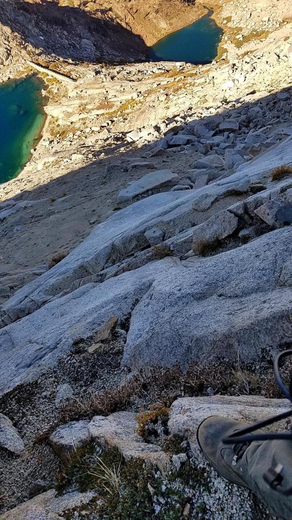 It began alright up the trail leading to the Sawtooth Pass. It was just like the any other time I got on any other trail after a night in the wilderness. That was until I decided to get off the trail and take a shortcut up to the ridge between the Pass and Sawtooth Peak. Looking back, for my first time that high, I probably should have stuck to the trail to the Pass and hiked along the ridge to the Peak. Instead, things got interesting: Scrambling is a different level of hiking. The route was not obvious. I eye-balled it and tried to make my own path to the ridge avoiding possible obstacle and traps. Sometimes my paths joined other foot prints but often there were none. Occasionally, I used my hands for supporting, securing, and pulling. Perhaps I reached about half way up the ridge above upper Monarch Lakes before I decided to call it a day. With my large backpack, which I am still getting used to, I felt I could not safely overcome an impasse which required the use of my hands but did not afford space to possibly keep myself from falling backwards. Being not in the best of conditions, it was the right call.
