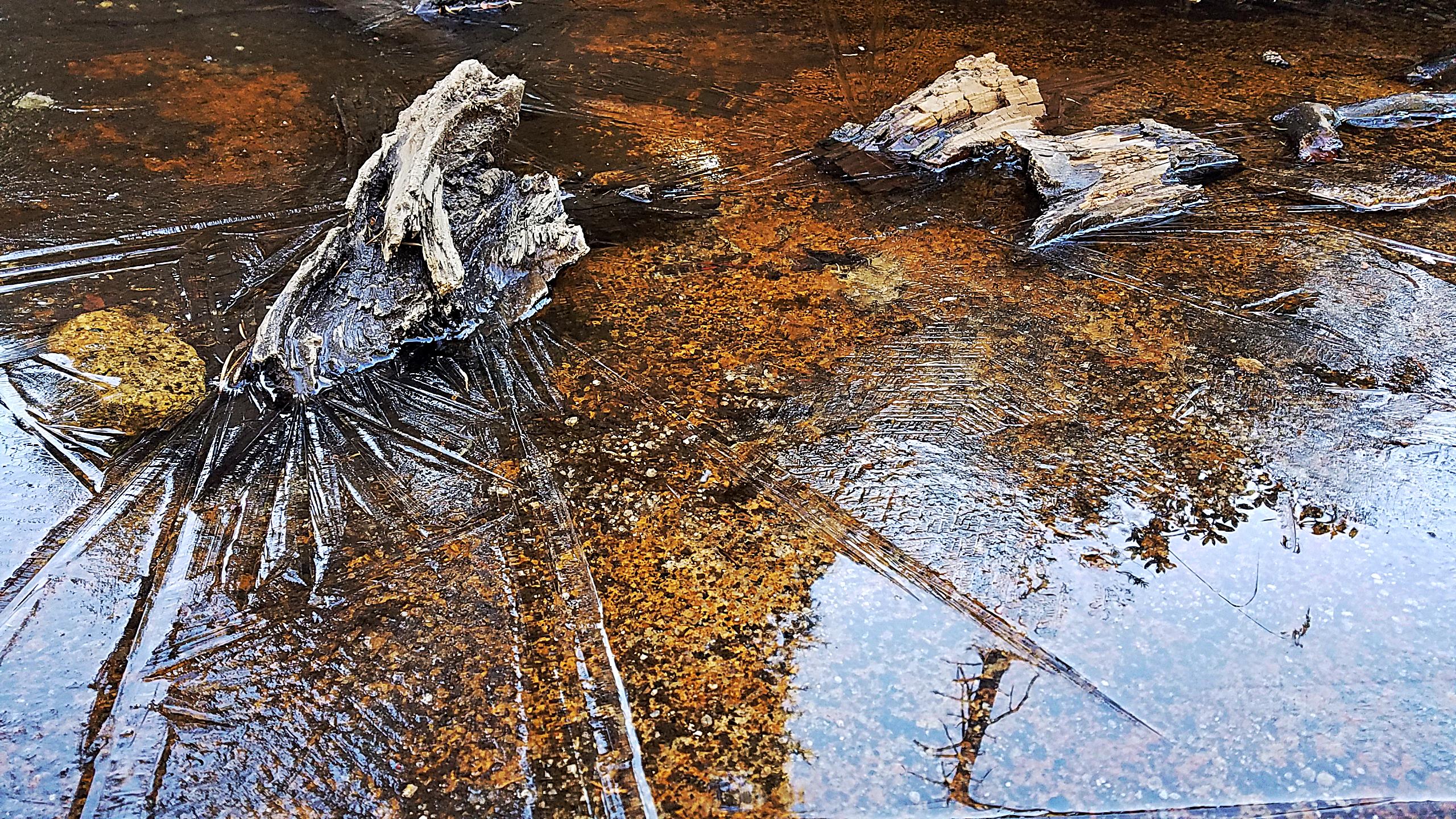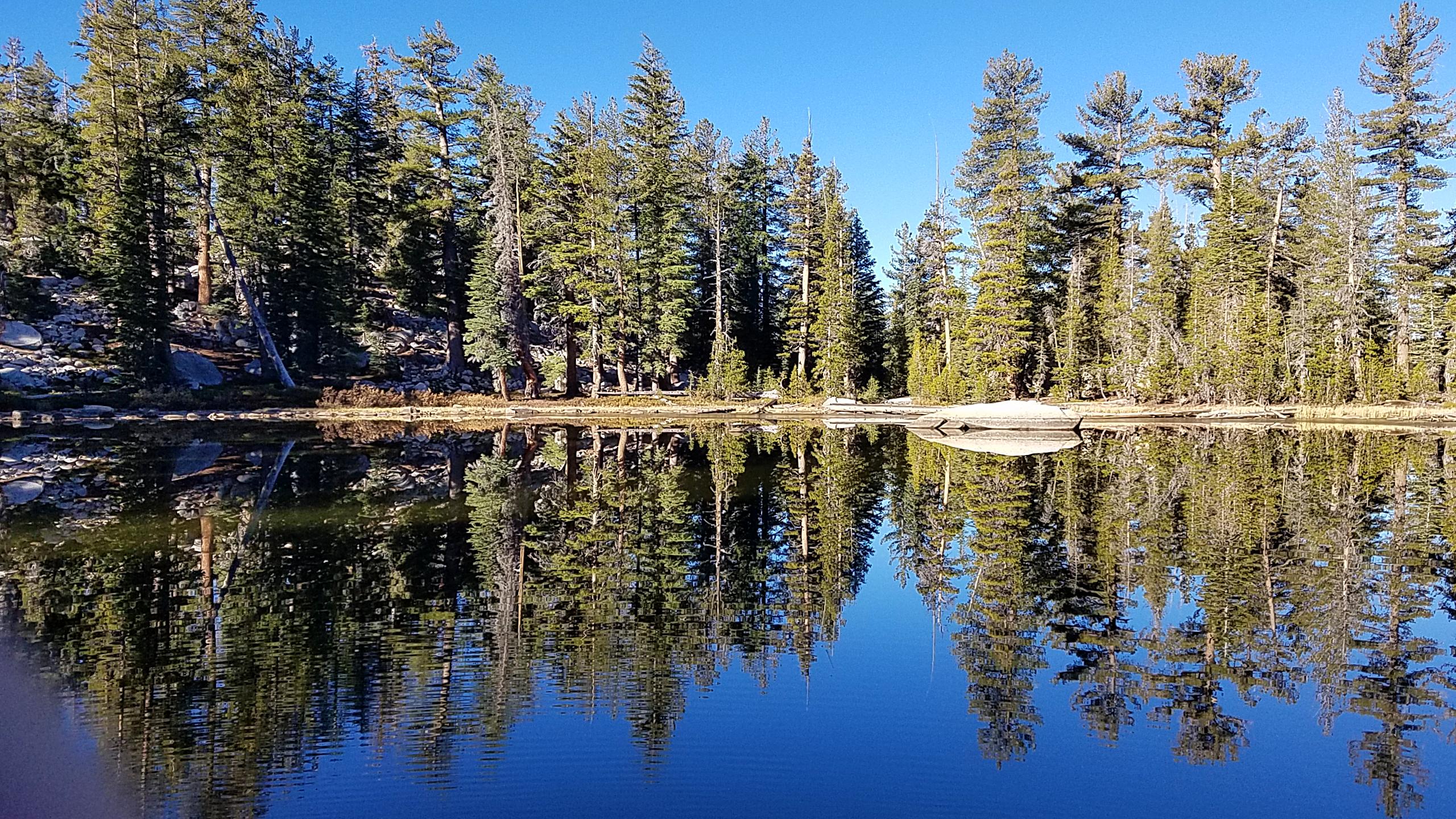 Then it’s only a couple of hundred feet down to mostly even trail to the next junction. It was a nice break at the unnamed lake, which perfectly mirrored the clear blue sky. There was some icing on the southern shore.